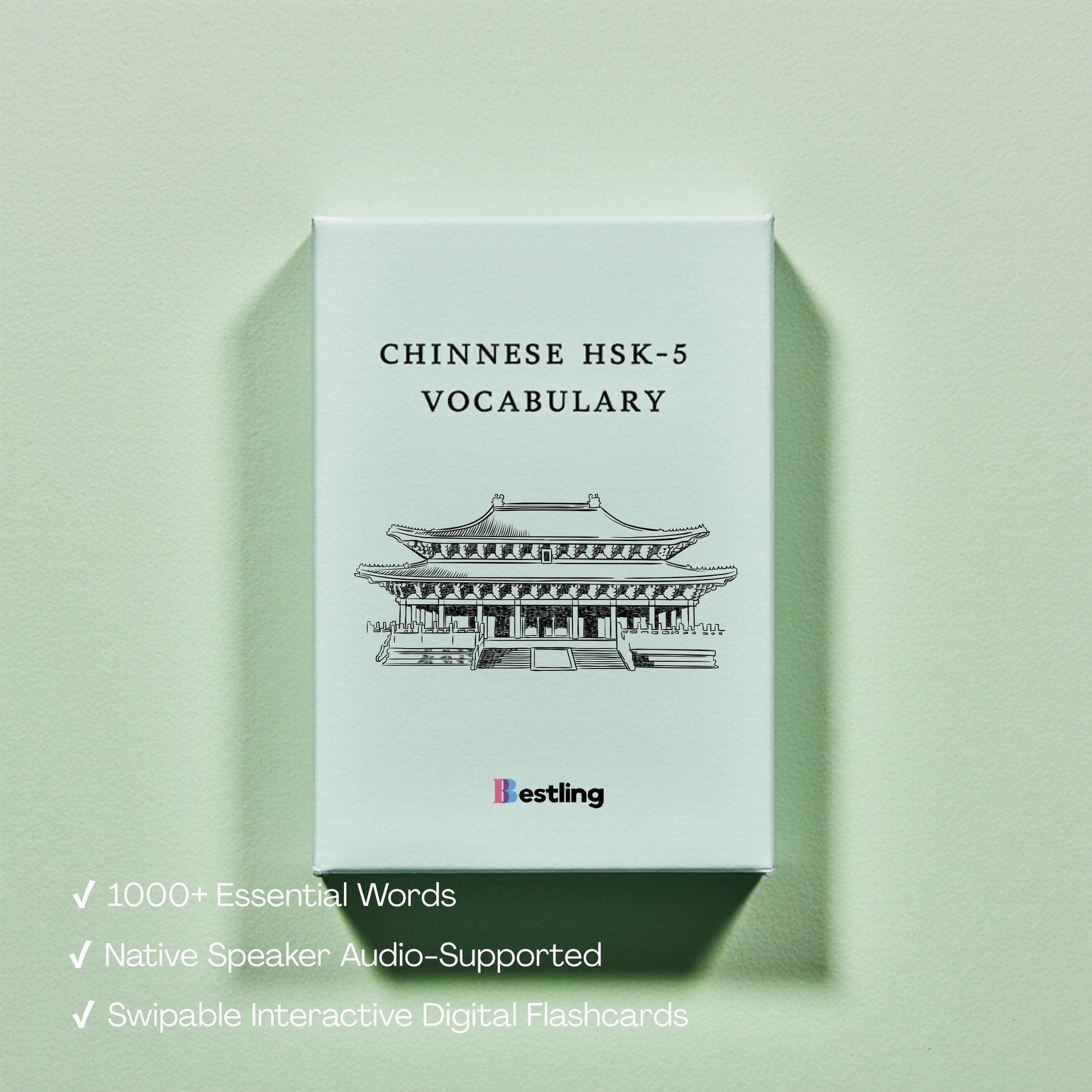 Bestling’s HSK 5 Digital Flashcards give you everything you need to learn, practice, and retain over 1000 essential Chinese words. Designed for beginners, these flashcards combine native speaker audio, interactive swiping, and smart spaced repetition so you can build strong foundations in Mandarin anytime, anywhere.